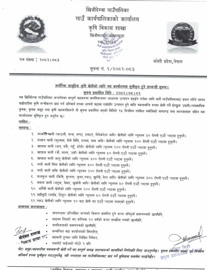 अर्गानिक सामुहिक कृषि खेतीको लागि सूचीकृत हुने सम्बन्धी सूचना।