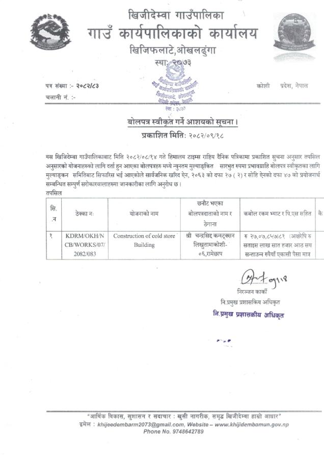 » बोलपत्र स्वीकृत गर्ने आशयको सूचना!