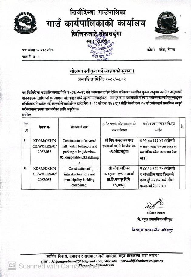» बोलपत्र स्वीकृत गर्ने आशयको सूचना!