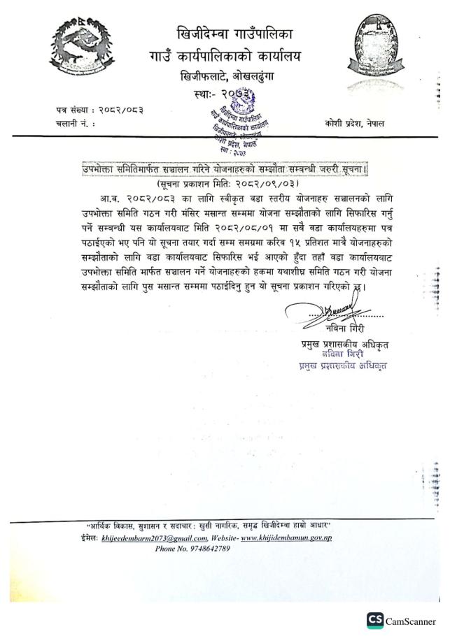 उपभोक्ता समिति मार्फत सञ्चालन गरिने योजनाहरूको सम्झौता सम्बन्धी जरुरी सूचना !!