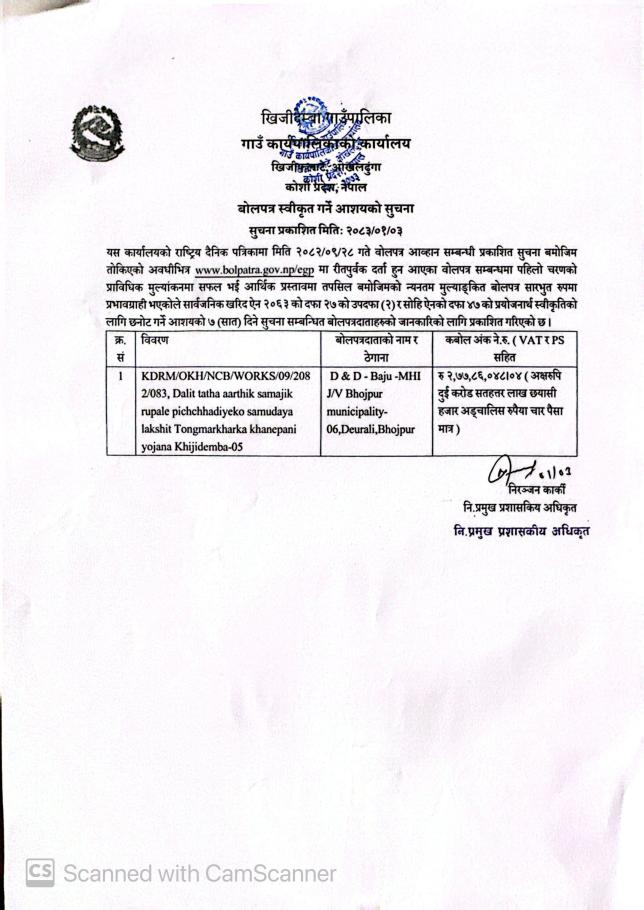 बोलपत्र स्वीकृत गर्ने आशयको सूचना!!