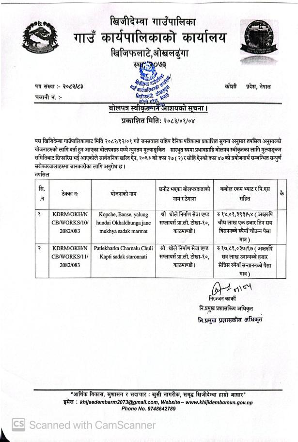 » बोलपत्र स्वीकृत गर्ने आशयको सूचना!