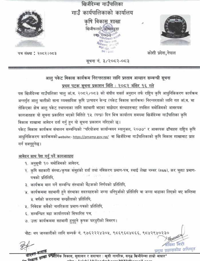 आलु पकेट विकास कार्यक्रम निरन्तरताका लागि प्रस्ताव आह्वान सम्बन्धी सूचना!