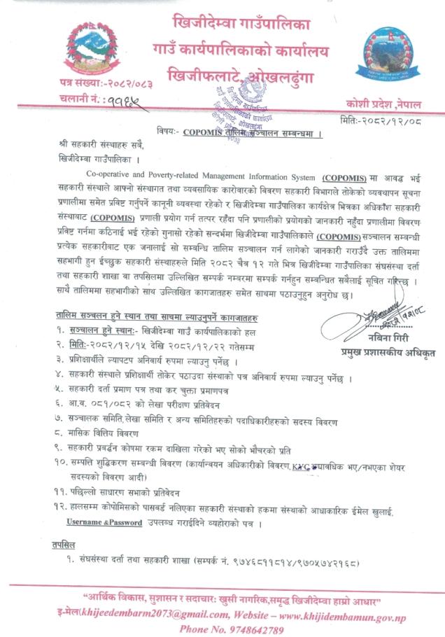 श्री सहकारी संस्थाहरू सबै, खिजीदेम्वा गाउँपालिका, ओखलढुंगा COPOMIS तालिम सञ्चालन सम्बन्धमा!